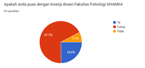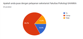 Pada hari Jumat, 14 Juli 2023 telah dilaksanakan Hari Aspirasi Psikologi ke Pimpinan yang dihadiri oleh tamu undangan dan mahasiswa aktif. Dengan agenda pemaparan hasil riset Aspirasi Mahasiswa yaitu mengenai kepuasan mahasiswa mengenai hal-hal yang ada di Fakultas seperti pelayanan sekretariat, pelayanan keuangan, kinerja dosen, sarana prasarana, dan program untuk Mahasiswa Aktif Fakultas Psikologi UHAMKA. Hasil riset telah di isi oleh 65 orang Mahasiswa Aktif Fakultas Psikologi UHAMKA dari angkatan 2019 – 2022 dengan tingkat presentase yang berbeda-beda dengan hasil berikut :